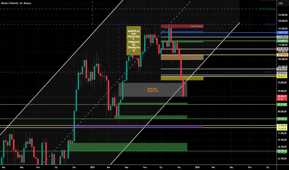 Herkese selamlar. Bugün Bitcoin tarafında epey sert hareketlere tanık olduk ve bu hareketler çok da hoşumuza giden bir noktada değil. Çünkü bunun en temel sebebi, destek bölgelerin şu ana kadar çalışmaması! Eğer birileri buradan, şuradan dönecek diyerek emin konuşuyorsa o kişiden uzak durun arkadaşlar! Çünkü şu anda piyasada ne olduğuna dair kimsenin en ufak bir fikri yok diyebilirim. Olumlu habere rağmen fiyat intihar ediyorsa arka bahçede neler oluyor bunu bilmek kolay değil! Piyasa şu anda belirsizliğine devam ediyor. Elbette destek bölgeler var ama şu ana kadar destek noktalar çalışmamış durumda! Bundan sonrasının çalışacağı da soru işaretleriyle dolu. Vicdanım rahat. Çünkü kimseye para karşılığında yatırım tavsiyesi vermedim, kimseyi fomolandırmadım ve kimseye net konuşmadım. Her zaman bu piyasada bir yolculuğumuz var ve bu yolculuğumuzu olasılıklar üzerinde gerçekleştireceğiz dedim. Bu sebeple cebimizde neler bulunduruyoruz bu bizim için önemlidir görüşündeydim. Bunu yazmamın nedeni, 7 haftadır aşağı yönelik fiyat hareketiyle karşı karşıyayız. %32 düşen bir fiyat karşımızda durmakta! Sizlere bir şekilde yardımcı olmaya çalıştım ve düşüşlerde de sizinle olmaya gayret ediyorum. Lütfen ama lütfen piyasada fomolandıran ve hedef fiyat veren ağızlardan uzak durun derim. Çünkü fiyatın nereden döneceğini şu anda kimse kestirecek durumda değil. Şu ana kadar piyasaya manipülasyon ve belirsizlik hakimdi ama şu anda kaos hakim olmaya başladı. Tether tarafında döngünü henüz kırılmamışken Bitcoin tarafında döngü kırılımı, trend kırılımı gerçekleşmiş durumda! Şu anda alt bantları konuşmamız gereken bir durum olmaması gerekirken fiyat öyle bir yere geldi ki alt banları konuşmak geç oldu gibi. Ne ise, piyasa her geçen gün daha da sertleşiyor! Destek noktalarım bunlar. Dönüş beklediğim iki destek noktam var; Birincisi 83.000 aşılırsa 74.000.