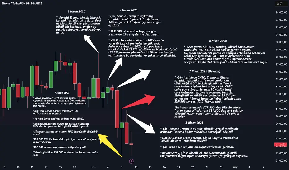 Amerika Başkanı Donald Trump'ın karşılıklı ithalat gümrük tarifelerini açıklamasıyla Nisan ayı itibariyle riskli varlıklar ve Bitcoin tarafında gün & gün yaşananlar. Grafik üzerinde gelen haberler & yaşanan gelişmelerle beraber fiyat hareketleriyle beraber göstermeye çalıştım.