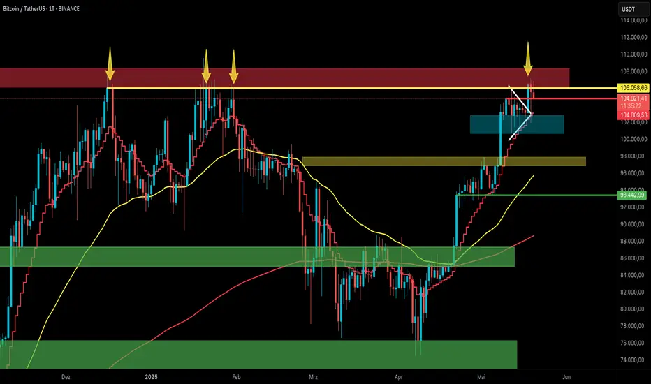Seit gestern hat sich das Marktbild kaum verändert. Die hellblaue Unterstützungszone hat dem Kurs erneut stabilen Halt gegeben. Aktuell nähert sich der Preis erneut dem Widerstand im Bereich um 106.000 USD, markiert durch die gelbe Linie.