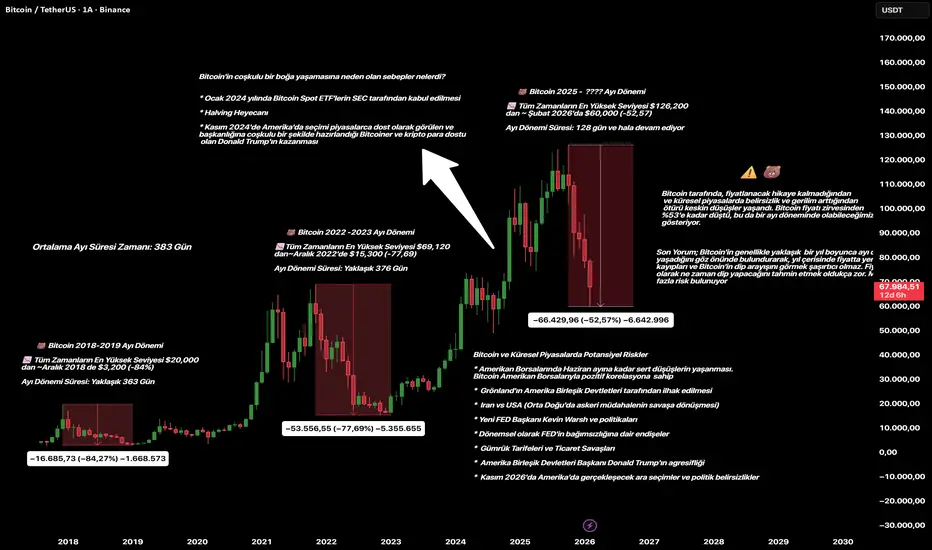 - Bitcoin tarafında ayı dönemlerinin ne kadar süreyle yaşandığına, geçmiş döngülerdeki düşüşlerin yüzdesi, küresel piyasaların ve Bitcoin'i etkileyebilecek riskleri itinayla grafikte belirttim.
