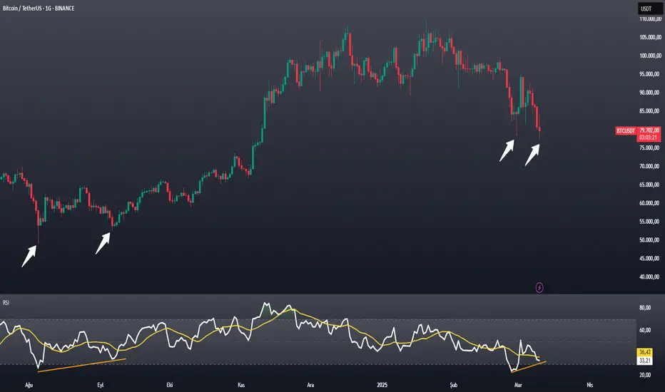 5 Ağustos 2024 çöküşünde de o fitili doldurup daha sonra yükselmişti. Bakalım yine aynı durum gerçekleşebilecek mi? SMA200'ü kaybetmek (83K) tabi ki tatsız. Ancak RSI bir önceki dipten daha yüksek bir dip yapıyor, pozitif uyumsuzluk oluşabilir.