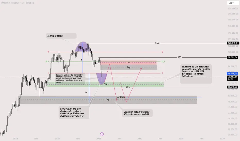Senaryolar masada grafik üzerinde anlatmaya çalıştım...Sadece sunu söyleyim 100k üstünde haftalık kapanışlar yapamıyan btc buradan yükseliyorsa yukarda ki fvg ob alanına cıkıp shortları patlatıp asagı geri düşmek içindir 45k ve daha alt seviyelere....