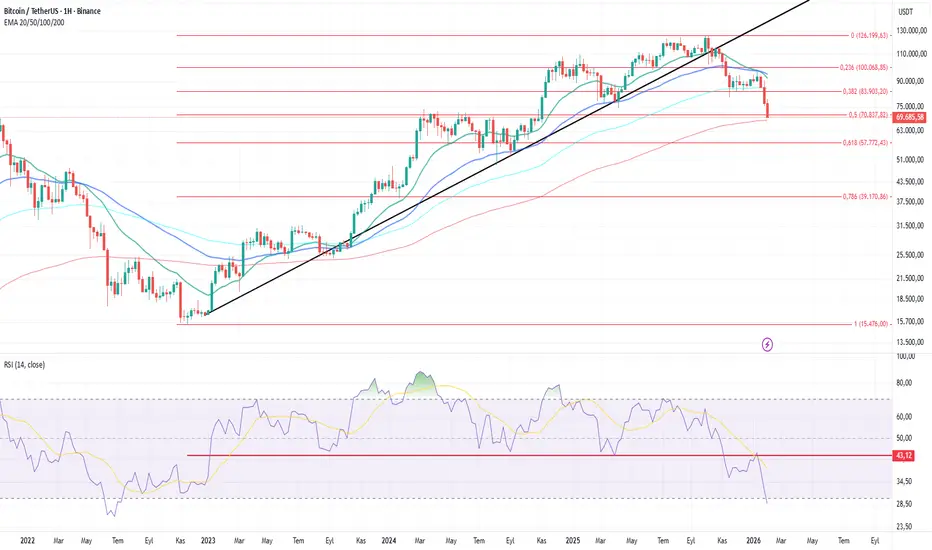 BTC için 21 Kasım tarihinde yaptığımız değerlendirmede; yükselen trend bozulduğunda 70.000 USD görür demiştik. EMA200 68.000 USD seviyesinden geçiyor. Haftalık aresay aşırı sat bölgesinde, ema200 den tepki ile yükseliş gelebilir.
