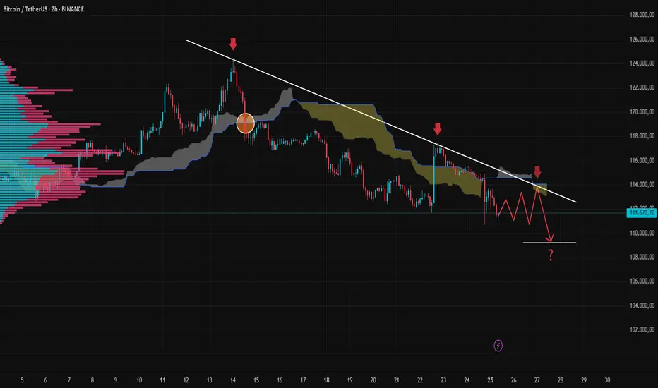 La estructura del máximo inferior se mantiene gradualmente. El bloque de la nube de Ichimoku actúa como resistencia dinámica. El perfil de volumen muestra una zona de soporte delgada por debajo, lo que significa que si se rompen los 110.000, la presión de venta podría ser mayor.
