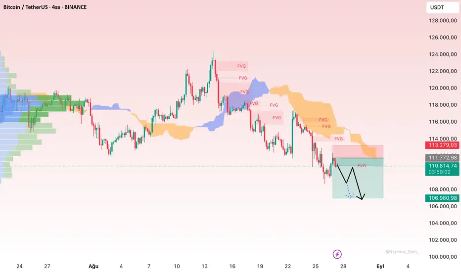 Herkese merhaba, H4 grafiğinde Bitcoin, $111.500–$112.000 USD bölgesinde güçlü bir dirençle karşı karşıya, burada FVG arz bölgesi ve Ichimoku göstergesindeki Kumo kenarı birleşiyor. Bu durum kısa vadeli bir geri çekilme olasılığını açıkça gösteriyor. Son mumlar artan satış baskısını gösteriyor: kısa gövdeler, uzun fitiller ve azalan hacim, alıcıların bu direnci kıracak güce sahip olmadığını gösteriyor. Fiyatın üzerinde bulunan Ichimoku bulutu düşüş trendini destekliyor ve Bitcoin’in bulutun üzerinde kalamaması düzeltme ihtimalini artırıyor.
