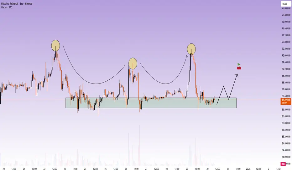 BTC fiyatı, zirvede yaşanan çoklu reddedilmelerin ardından talep bölgesinin (mavi taban) üzerinde konsolidasyona devam ediyor. Mevcut yapı, satıcıların artık fiyatı önemli ölçüde aşağı çekmediğini ve konsolidasyon aralığının kademeli olarak azaldığını gösteriyor → satış baskısının emildiğinin bir işareti.