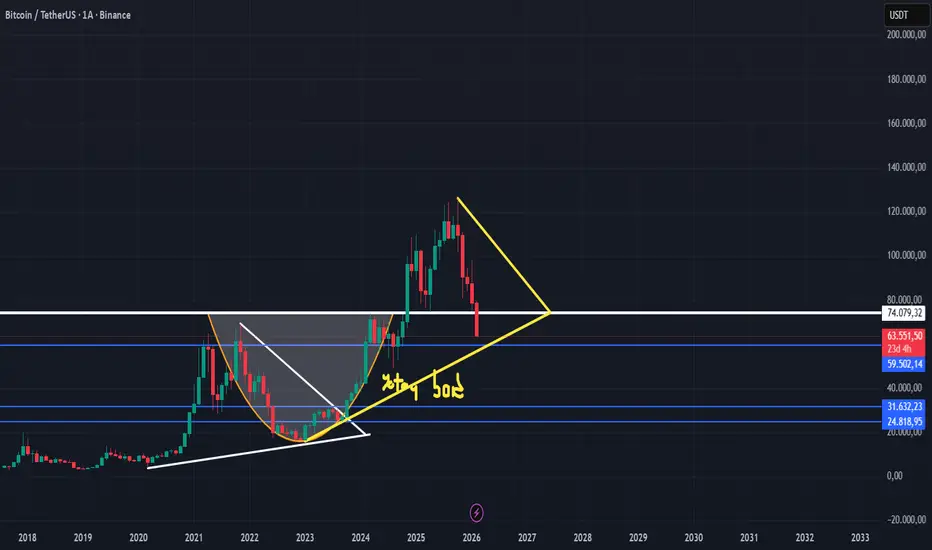 Çizmiş olduğum grafikler doğrultusunda 74k direnci hızlı bir şekilde kırıldı bi sonraki durak 59.500 veya 59k ya iğne atıp yükselmesi yönünde buradan döner mi tekrar yükseliş trendine bilmiyorum ama 59k direncini kırarsa 2028 e kadar ayı sezonuna girmiş bulunmaktayız aylık bazda golden cross dediğimiz olayda büyük bir ayı sezonuna girdiğimizi görebiliriz. Hala bir umut olarak 59.500 direncini de gözetebilirz 59k'dan dönerse tekrardan 74k direnci ve 90k dirençlerine hareket olacaktır 59k direncini kırarsa 30k ya kadar düşüş bekliyorum beklentilerim ve tahminlerim bu yöndedir.