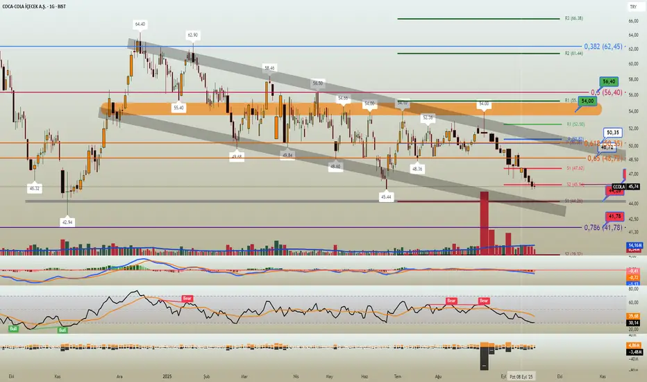 Hisse uzun süredir alçalan kanal içerisinde hareket ediyor. Şu anda kanalın alt bandına oldukça yakın (44,26 TL civarı). Bu bölge kısa vadede kritik destek olarak öne çıkıyor.