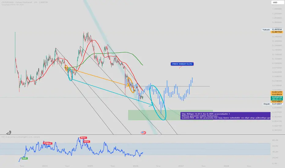 Alçalan kanal yapısı içerisinde fiyatın daralan bir kama (wedge) formasyonu sergilediği ve "Dip Bölge" olarak işaretlenen 0.013$ - 0.005$ aralığının makro bir birikim (accumulation) alanı olduğu öngörülmektedir.