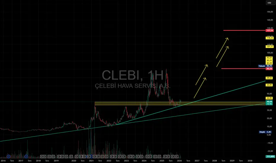 #CLEBI USD bazlı grafikte orta vadede incelendiğinde, ana yükselen trendin dip bölgelerinde fiyatlandığı görülüyor. Bu bölge, trend devamı ve güçlü tepki potansiyeli açısından dikkat çekmektedir.