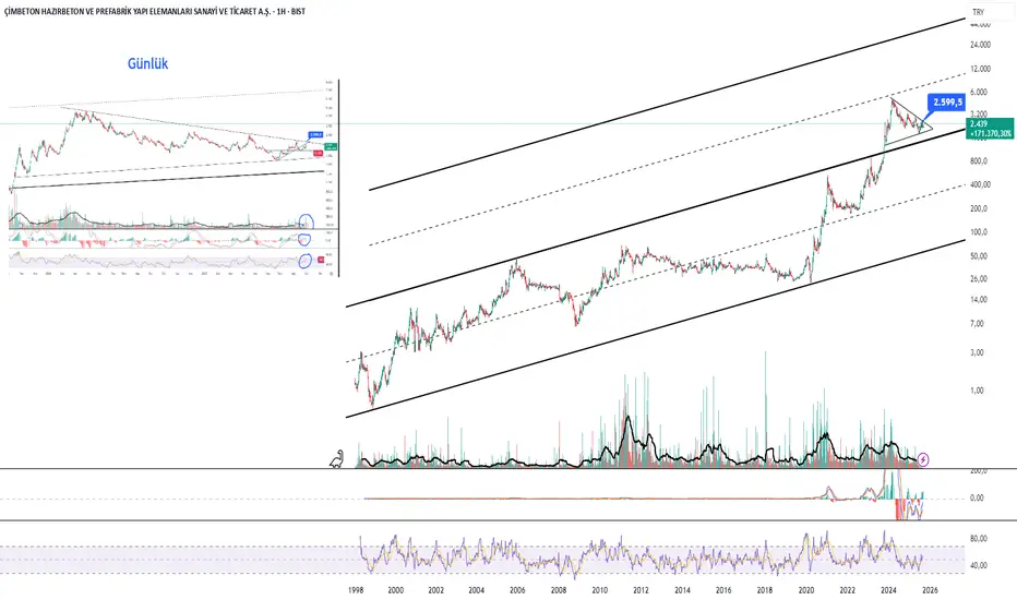Uzun vadeli yükseliş trendi devam ediyor. Grafik, logaritmik ölçekte büyük bir kanal içine alınmış. Hisse şu anda kanalın orta bandı üzerinde tutunmaya çalışıyor.
