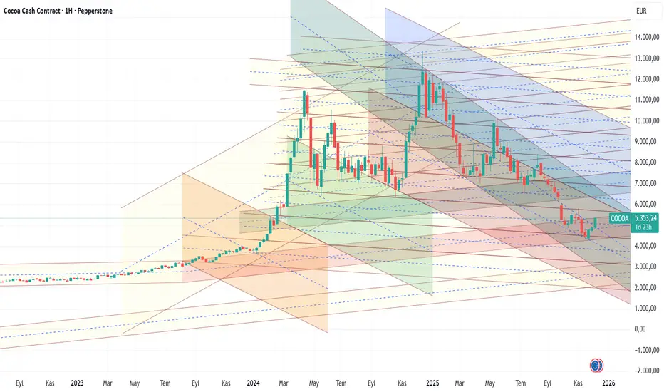 Uzun Dönem Kakao grafik çizimim. İleriki dönem olası hareketler bu çizimler arasında olacağı fikrindeyim. Ocak 2026 Sonu itibarıyla euro bazlı grafikte fiyat artışı olacağı, Nisan 2026 ile bir üst kanala geçerek artışın hızlanacağı fikrindeyim.