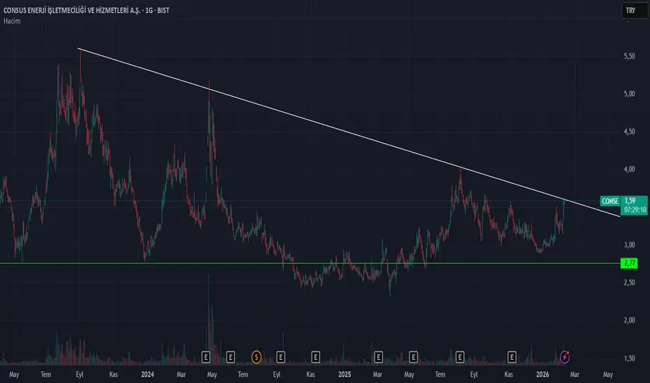 CONSE günlük grafikte düşen trendi kırmak için test ediyor, günlük kapanış önemli.