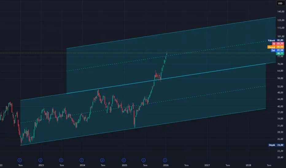 Neden size COPX tanıtıyorum çünkü diğerlerine nazaran Nisandan beri başlayan yükselişte % 178 ile en fazla getiriyi sağlayan ETF COPX oldu. Haftalık grafikte görebileceğiniz gibi (tabiki global bakır fiyatlarındaki artışla) 2022 Temmuzda başlayan yükselen kanalı Temmuz 2026 da kanal katlayarak yeni bir kanalda yolculuğuna devam etmekle hatta ikinci kanalında şu sıralar orta bandını kırmakla meşgul ETF'miz.