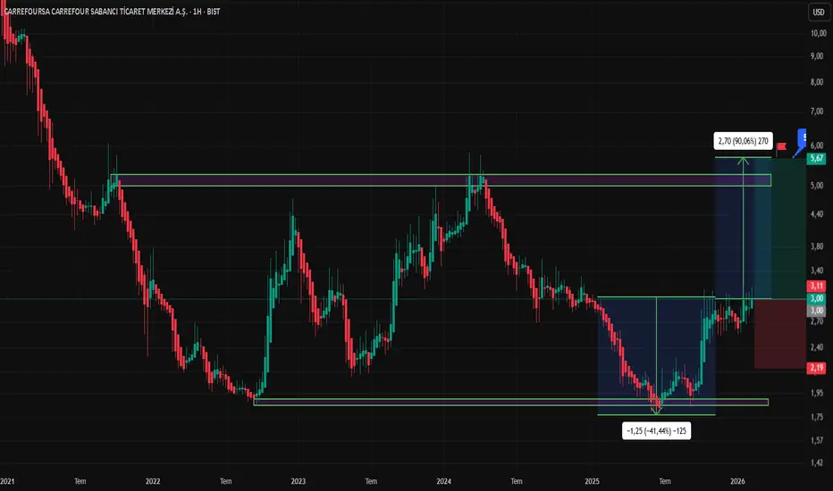 100TL fiyat bandından portföyümüzde ve takibimizde yer alan CRFSA an itibari ile 3,11$ fiyat bandından işlem görmeye devam etmektedir. Orta ve uzun vade için yatırım yapıla bilinir seviyelerde olduğunu belirttiğimiz CRFSA aylık gerçek bir trend oluşturma çabası içerisinde diye biliriz ancak haftalık trendin halen devam ettiğini ve yükselen fiyat hedeflerinin hacimden kaynaklı gecikmeler dahi olsa CRFSA fiyat ve performans açısında gayet güzel görünüyor.