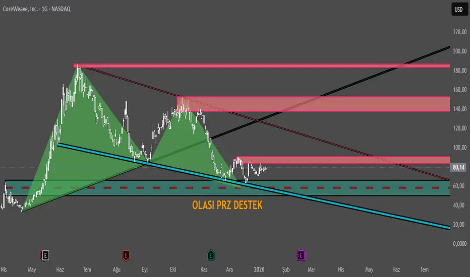 Bu çalışma, CRWV CoreWeave hissesi için fiyat hareketi takibi amacıyla çizilmiş eğitim odaklı bir analizdir. Grafikte geçmiş fiyat davranışları, olası tepki bölgeleri ve senaryo bazlı hareketler izlenmektedir. Kullanılan seviyeler kesin alım veya satım sinyali değildir ve tek başına karar verme amacı taşımaz. Risk ve para yönetimi her zaman önceliklidir. Bu içerik yatırım tavsiyesi değildir (ASLA YTD).