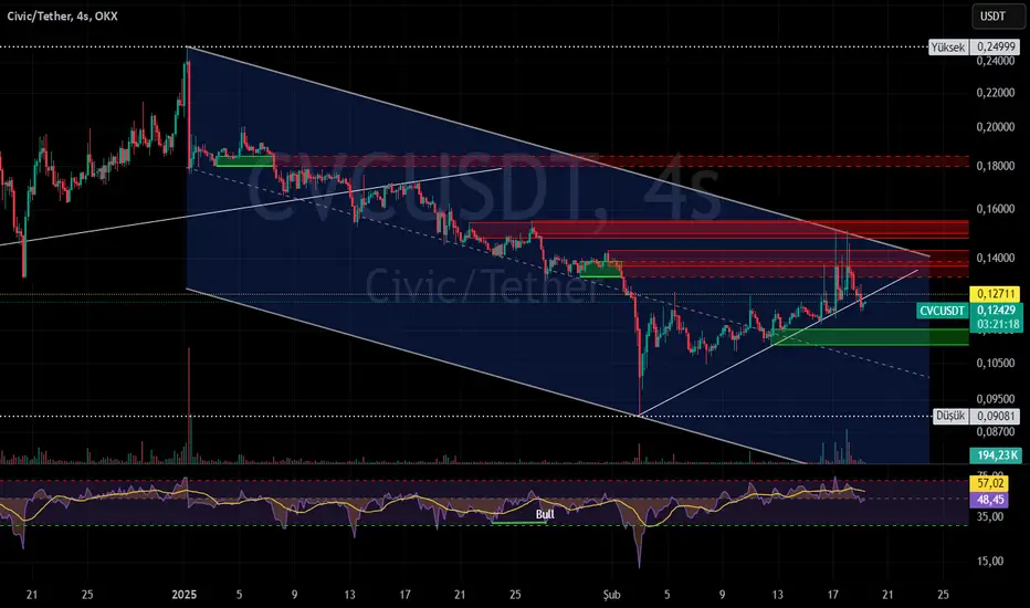 0,25$ seviyesinden yeni düşüş trendine giren CVC altta 0,009$ bölgesini test etti destek olarak 0,11$ - 0,115$ beklenebilir 0,15$ üzeri kapanışlarda 0,18$ ve 0,25$ takip edilebilir