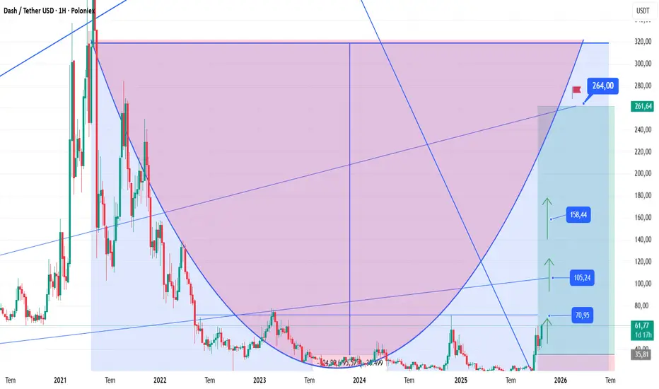 6 Ekimde 33$ seviyesinden portföye eklediğimiz ve yatırım yapılabilinir seviyelerde olduğunu belirttiğimiz DASH coin için an itibari ile 63 dolar fiyat bandında hareket ettiğini 150Milyon dolar üzerinde seyreden işlem hacmi ile işlemlere devam etmektedir. 1 Ay zaman zarfında 3 kez grafiğini paylaştığımı DASH coin için iki haftadır beklenen sert bir hareketliliğin geleceğini özellikle belirtmiştik. Mevcut olan sinyalin akabinde gerçekleşen sert yükseliş ile günün en düşük seviyesi 40$ bandından 100 milyon$ üzeri hacim ile 63$ seviyelerini test eden DASH için, teknik açıdan baktığımızda beklenen fiyat hareketliliğinin gerçekleşmesi hacimde yaşanan artış, OBV MOM birlikte hareket ettiğini yükselen fiyat sinyalinin devam ile sıralı hedefler olarak 77-83-99$ sıralı seviyelerinin beklenilmesi daha sağlıklı olacağı öngörüsündeyim.