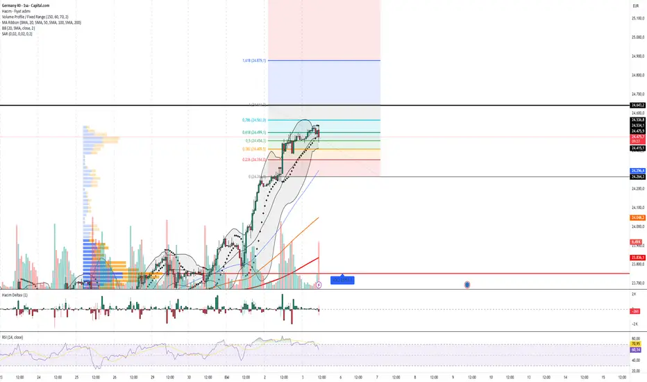 DAX endeksi güçlü bir yükseliş trendi sergileyerek 24.640 seviyesine kadar tırmanmış durumda. Ancak bu bölge aynı zamanda hem önemli direnç alanı hem de psikolojik bir eşik konumunda. Grafikte son mumlarda dirençten gelen satış baskısı net şekilde görülüyor.
