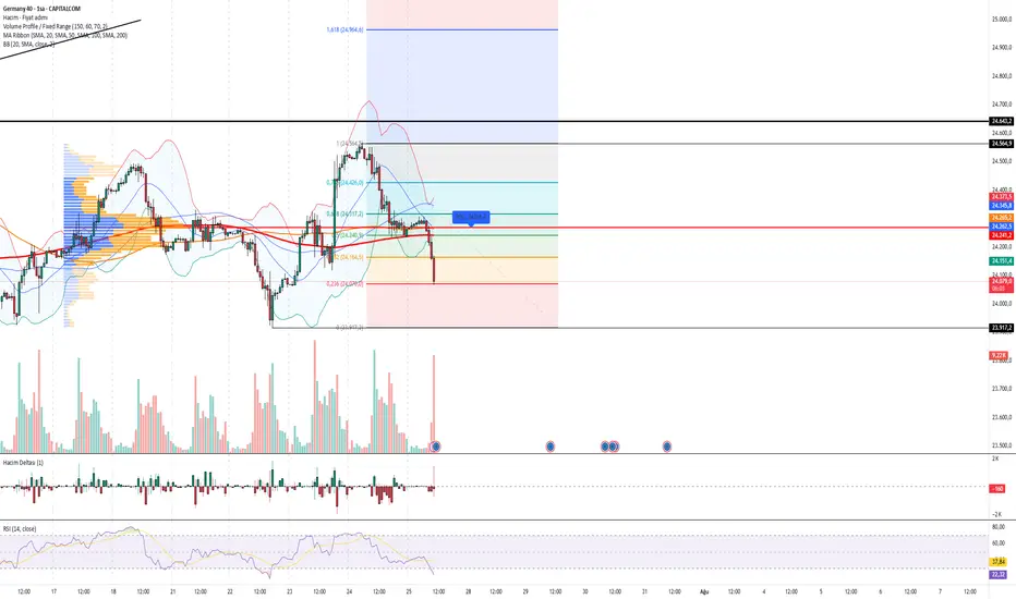 DAX endeksi, 24.564 zirvesinden gelen satışlarla birlikte 24.077 seviyesine kadar gerilemiş durumda ve düşüş momentumu güçlenmiş görünüyor. Kırmızı hacimli mumlar ve hacim artışı, satış baskısının kuvvetlendiğine işaret ediyor. Aynı zamanda Bollinger alt bandına temas edildi.
