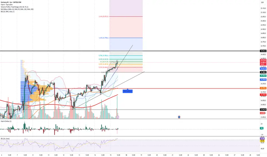 📌 ÖzetDAX, güçlü bir momentumla kritik direnç bölgesine dayanmış durumda. 24.586 üzerinde kapanış yapması hâlinde 24.800 ve 25.050 seviyeleri hedeflenebilir. RSI’ın aşırı alım bölgesinde olması, kısa vadeli geri çekilme riskini artırıyor. Destek olarak 24.446 ve 24.300 seviyeleri izlenmeli.