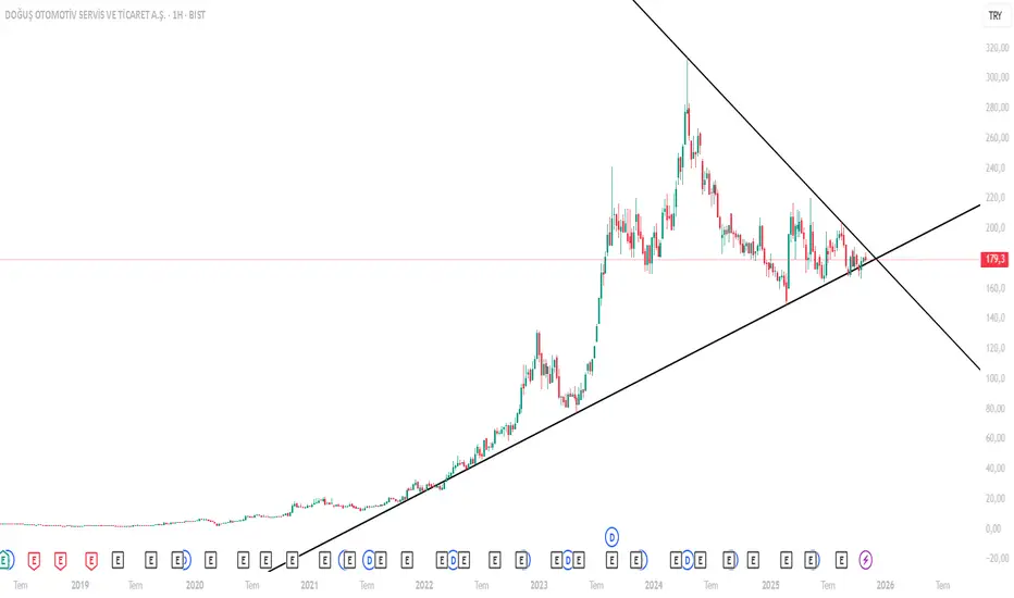 DOAS (Doğuş Otomotiv Servis ve Ticaret A.Ş.) fiyat hareketi, uzun vadeli bir teknik formasyonun son aşamasına yaklaştığını gösteriyor.