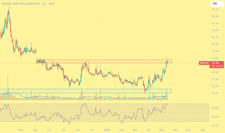 DOFER hissesi ilk talep bölgesinden güç aldıktan sonra hacimli şekilde arz bölgesine ulaştığını görüyoruz. Bu bölgedeki fiyat hareketleri ve bölgenin kazanımı takip edilmeli.