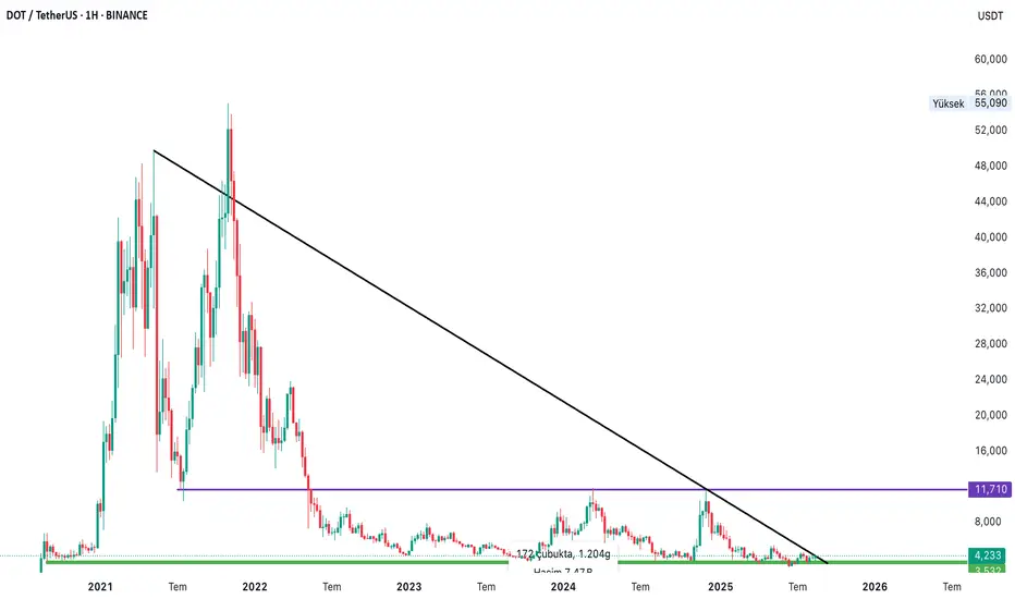 Şuan, 172 haftadır, yaklaşık 3.5 yıldır alt bölgede akümüle oluypor. Tam kırılımın eşiğinde, düşen diagonal direnç kırıldığında mor çizginin çekim alanına girer. Mor aşıldıktan sonra hareketleri hızlanır.