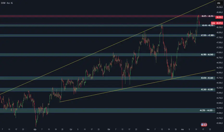 Dow30 yükselen trendimiz 4H hafta kapanışını yeni ATH yaparak 48.900 den dönüş yaparak yeni direnc oluşturdu altta 48.410--48.310 destegine kadar düşüş yaparak kapanış yaptı.... hafta açılışı ile yukarda yaptığı direnç olarak 48.900 bulunmaktadır. Düşüşün devamı için bulundugu destegi kırılım sonrası ilk destegi 46.980--46.840 bulunmaktadır...