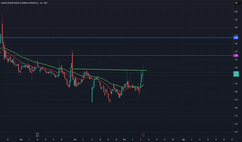 Yeşil çizgi üzeri kapanışlar görebilirsek ilk hedef çıkışın fibo 1.414 denk gelen 3.45 ana hedef 3.68.