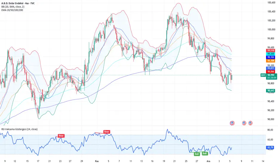 Düşüş trendinde #dxy 99,065 seviyesi önemli bir direnç seviyesi. Üzerine atar ise 99,20 - 99,30 - 99,51 seviyesine kadar pozitif ivmeli hareketine devam eder. Yalnız düşüş momentumu daha ağır basıyor. 99,065 seviyesinin altına attığı amda 98,80 - 98,65 düşüş devamı halinde ise 98 seviyelerine kadar geri çekilebilir.