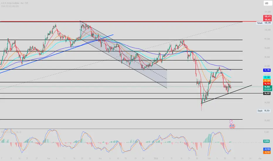 Fiyat saatlikte hareketli ortalamaların altında kısa vadede yükseliş trendi korunuyor. 96,50 desteği kritik ! Bu seviyenin altında satış baskısı yoğunlaşır.