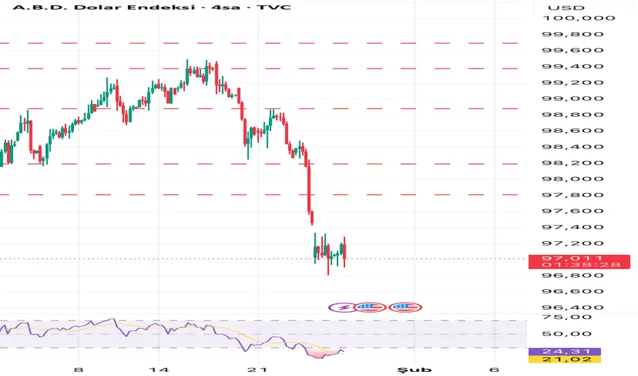 Dolar endeksi (DXY) şu anda 97.037 seviyesinde işlem görmekte. Teknik olarak, endeksin son zamanlarda yaşadığı geri çekilme oldukça belirgin ve aşağıdaki kritik destek seviyelerine yaklaşmış durumda. Şu anda belirgin bir şekilde 97.000 seviyesinin altına düşmekte, bu da doların daha fazla değer kaybedebileceğini gösteriyor.