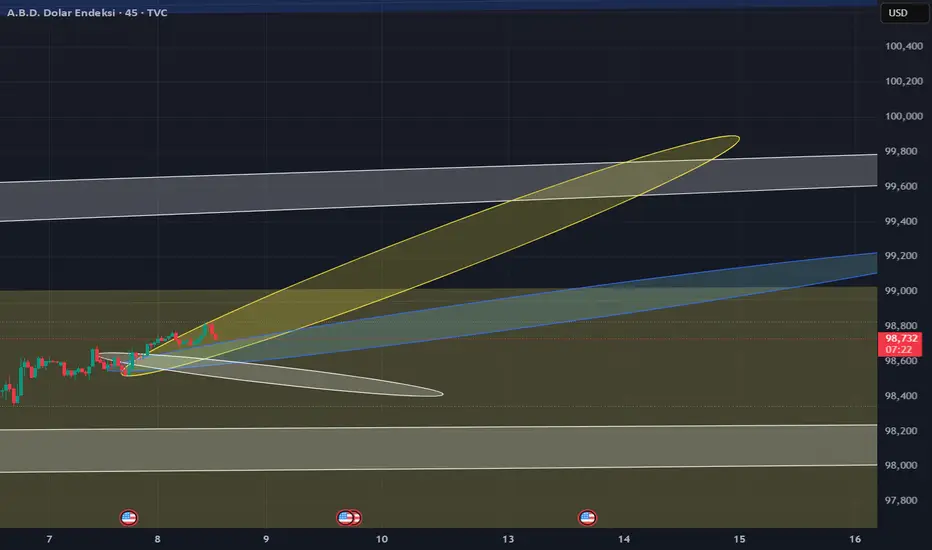 Tamam, DXY (Dollar Endeksi) – Yay diliyle, kırmızı liste sunucu havasında net bir okuma yapıyorum 👇