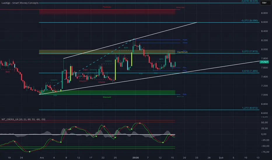 Trend Analizi: Hisse ana trend olarak yükselen kanal içerisindeki düzeltme fazındadır. SMA 50 seviyesi olan yaklaşık 7450 TL güçlü bir dinamik destek görevi görmektedir. Fiyatın 7700 TL üzerindeki kapanışları, kısa vadeli düşen trendin sonlandığına işaret etmektedir.