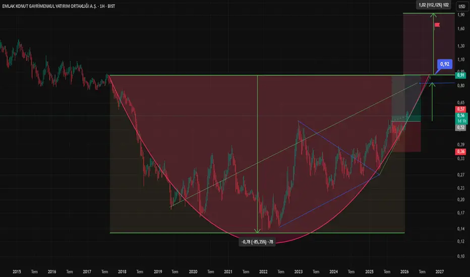Geçen ay paylaştığımız EKGYO hissesi an itibari ile 0,57$ fiyat bandından işlemlere devam etmektedir. Teknik açıdan genel görünüm halen pozitif haftalık trendin devamının geleceği hacim artışı ile yeni fiyat hedeflerinin beklenilmesi gerektiği kanaatindeyim. Endekse paralel hareket eden EKGYO için orta ve uzun vade yatırım yapıla bilinir seviyelerde olduğunu USD paritesine göre hala ucuz kaldığını söylemek mümkün piyasa da gelişmeler ve beklentiler doğrultusunda faiz indirimleri beklentisi arttıkça GYO hisselere pozitif yansıması ile orta ve uzun vade için görünüm pozitif.
