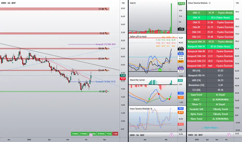 EKOS günlük grafikte düşen kırılımı yapmak üzere hacim artışı dikkat çekici. 19,50 altında stop olmak şartıyla takip edilebilir