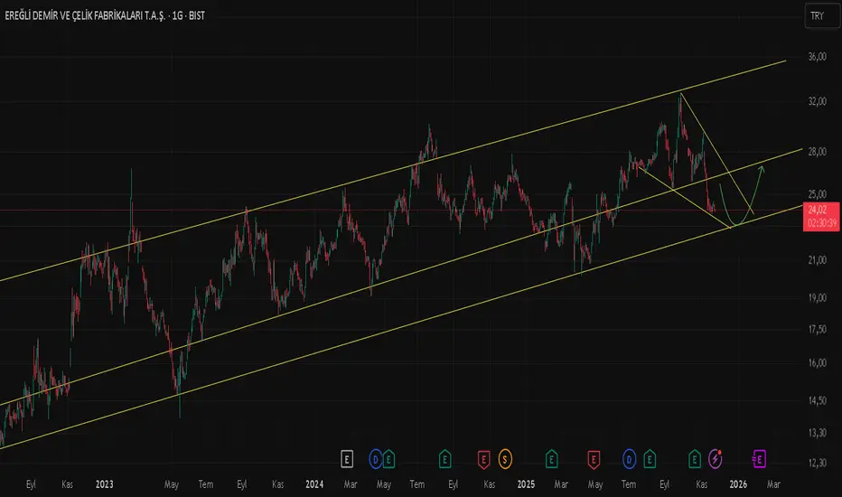 EREGL grafiğinde tekerleği yeniden icat etmeye gerek yok; 2023'ten beri tıkır tıkır çalışan devasa bir "Yükselen Kanal" var. Ve şu an filmin en heyecanlı yerindeyiz: Fiyat, daha önce defalarca sektiği o meşhur sarı destek çizgisine (24) geri döndü.