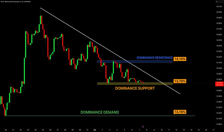 • Dominance Resistance (14.10%): Hem yatay direnç hem de düşen trend çizgisiyle birleşen bölge. Bu seviye kırılırsa Ethereum, diğer altlara karşı güç kazanır...