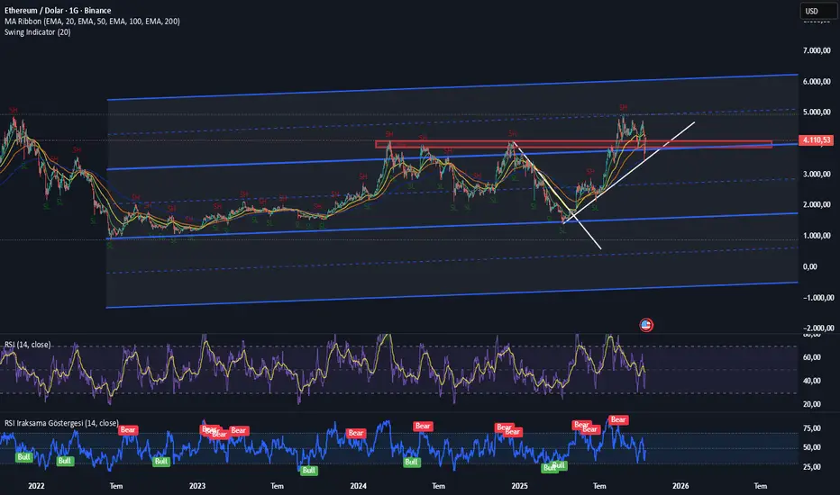 3200 dolar maliyet ile yaklaşık 1 senedir ethereum pozisyonu taşıyorum. 10 Ekim 2025 Cuma günü yaşanan çılgın düşüşte zarara geçmedim ama pozisyonum beni oldukça korkuttu. Bu sırada 3650 dolardan 1 ethereum daha maliyetlendim. Grafiğe baktığınızda Haziran 2022den beri gelen bir kanal var. Ethereum bu kanalın içinde gidip geliyordu. Ağustos 2025 ayında ise bu kanalı yukarı yönlü atladı. Ve yukarıdaki kanalın orta noktasından bir tepki yedi.Cuma günü yaşanan düşüş ile aslında hem kanal dibinden hem de trend dibinden güzel bir retest yapmış oldu. Bu noktaların daha aşağısına düşmemesi benim için sevindirici. Şu anda 3850 seviyesini destek olarak görüyorum. Bu seviyelerin yukarısında kalması benim için pozisyonumu devam ettireceğim anlamına gelir. Şu anda ilk hedefim 4900 dolar seviyeleri. İkinci hedefim ise kanal tepesine yakın bir nokta olacak olan 5750 dolar seviyesi olacaktır. 4900 dolar seviyesinde rsi göstergesini de takip edecek olacağım. Duruma göre %50 kar realizasyonu yapabilirim.