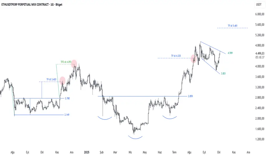 ETHUSDT’de megafon formasyonu tamamlanmak üzere. Geçmişte benzer yapılar hedeflerine ulaşmıştı; bu da neden olmasin dedirtiyor.