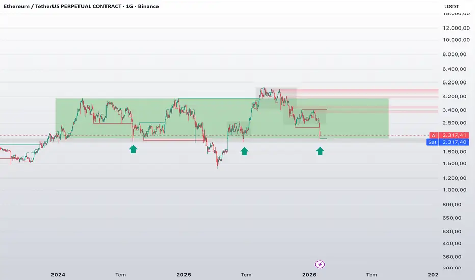 Ethereum uzun süredir geniş bir yatay bant (range) içinde işlem görüyor ve piyasa hem üst arz bölgesine hem de alt talep bölgesine net şekilde saygı gösteriyor.