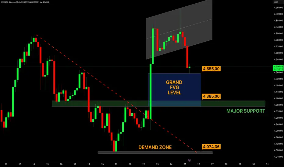 Ethereum, güçlü bir kırılım sonrası Grand FVG Level olan 4.555$-4.385$ bölgesine doğru geri çekiliyor. Bu alan kısa vadede fiyatın denge arayışı içinde olduğu önemli bir bölge...