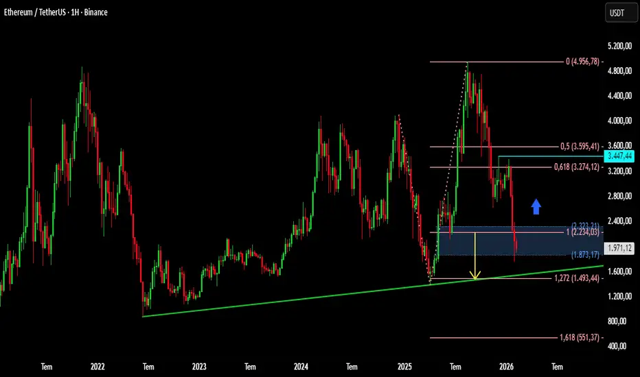 ETH'de düşüş baskısı sürmektedir. Bu baskının hafiflemesi için ilk etapta 2330 üzerinde haftalık kapanış görmemiz gerekmektedir. Bu kapanış gerçekleşmediği sürece fiyatın yeşil renk ile görülen yükselen alt trend çizgisine kadar düşmesi söz konusu olabilir. Bu da yuvarlak olarak 1500 civarlarına tekamül etmektedir.