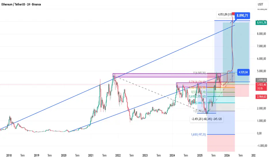 Teknik olarak baktığımızda aylık halen güçlü bir trendin devam ettiğini ancak aynı trendin BTC için geçerli olmadığını Bitcoinde geri çekilme seviyelerinin testinin başladığını 100.000$ altında kaldığı müddetçe Ethereum'un bu süreçte BTC'den pozitif ayrışacağınız BTC ile arasında ki makas farkının kapandıkça BTC.DOM endeksinde geri çekilmelerin devam edeceğini bu kısa vadede 5500$ sıralı hedefini gerçekleştireceğini öngörüyor ve üzerinde kaldığı müddetçe yeni fiyat hedeflerinin geleceğini düşünüyorum.