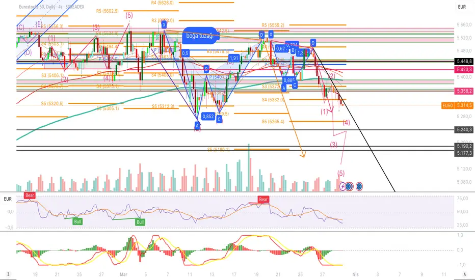 Avrupanın küçük 50 şirketinin bulunduğu eurostock 50 endeksinde 19 martta oluşumunun D noktasını tamamlayan formasyon düşüşüne devam ettirmekte. Formasyoonun tamamlaması için 5180 bölgesine kadar düşüşünü devam ettirebilir.