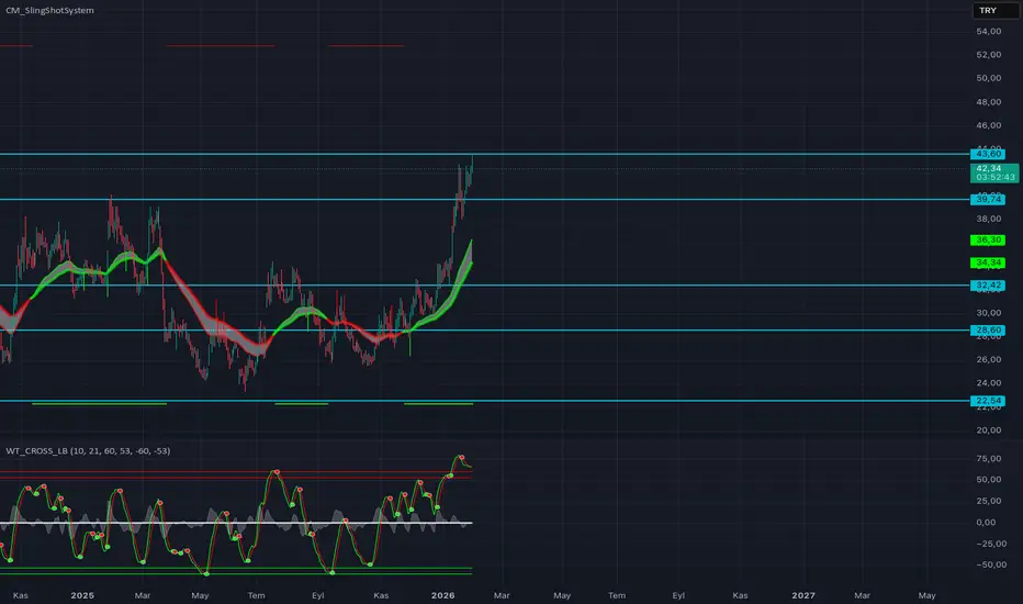 Ana trend YUKARI. 43.68 TL zirve direnci kapıda. Burası kırılırsa "Mavi Gökyüzü" formasyonu (Price Discovery) başlar. Geri çekilmelerde 41.00 - 41.50 TL bandı beton gibi destek olmalı.