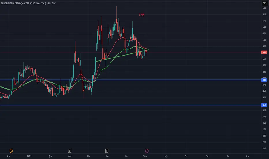 Yeşil çizgi altında kaldığımız sürece ilk hedef düşüşün fibo 1.414 denk gelen 4.55 ana hedef 3.76.Yeşil çizgi üzeri kapanışlarda zarar kes.