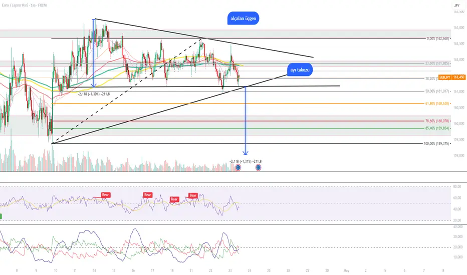 Eur Jpy belli bir süredi geniş zaman aralıklarından 1 saatliğine gelindiğinde alçalan tepeler yaparak ilerlemektedir. Bu tepelerin sonunda formasyon oluşmu başlamış ve kırılım noktasına gelmiş olabilir miyiz? Formasyonun oluşum şekli altta yer almaktadır.