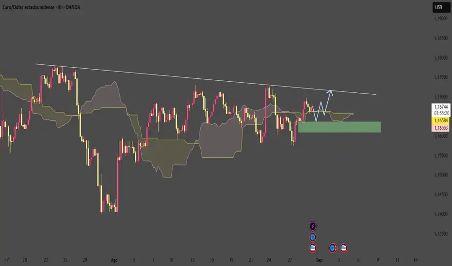 El gráfico de 4H de EURUSD muestra que el precio actualmente enfrenta una zona de resistencia en 1.17200. Si se rompe este nivel, el siguiente objetivo podría ser 1.17400. El soporte clave se encuentra en 1.16400, y si el precio no lo rompe, la tendencia alcista podría continuar.